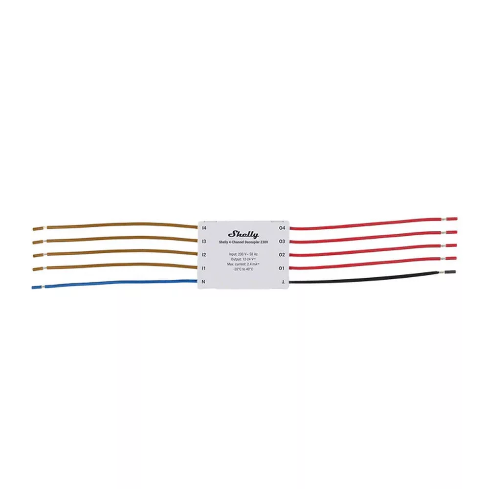 A Shelly 4-Channel Decoupler 230V egy négyszeres leválasztó modul, amellyel a meglévő 230 V~ jel (pl. fali kapcsoló, relé kimenet) biztonságosan alakítható át alacsony feszültségű DC indítójellé. Így AC oldali vezérlőelemekkel is meghajthatók a Shelly eszközök digitális (DC) bemenetei anélkül, hogy a hálózati feszültség közvetlenül a kisfeszültségű oldalra kerülne.