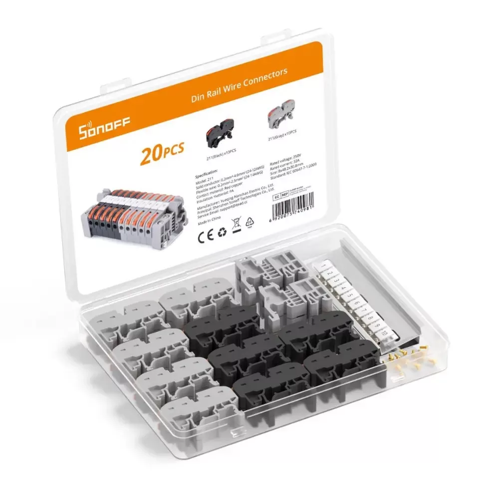 A Sonoff DIN-sínre illeszthető vezeték összekötői segítenek a vezetékek elektromos szekrényben való stabil, egyszerű és biztonságos összekötésében, és átlátható és biztonságos vezetékezést tesznek lehetővé. Tömör, sodrott vagy lágy rézhuzalok csatlakoztatására is használható. Kompatibilis a 0,2-4 mm² (AWG 28-12) vezetékekkel, max. 32A névleges áramerősséget is támogatnak.
